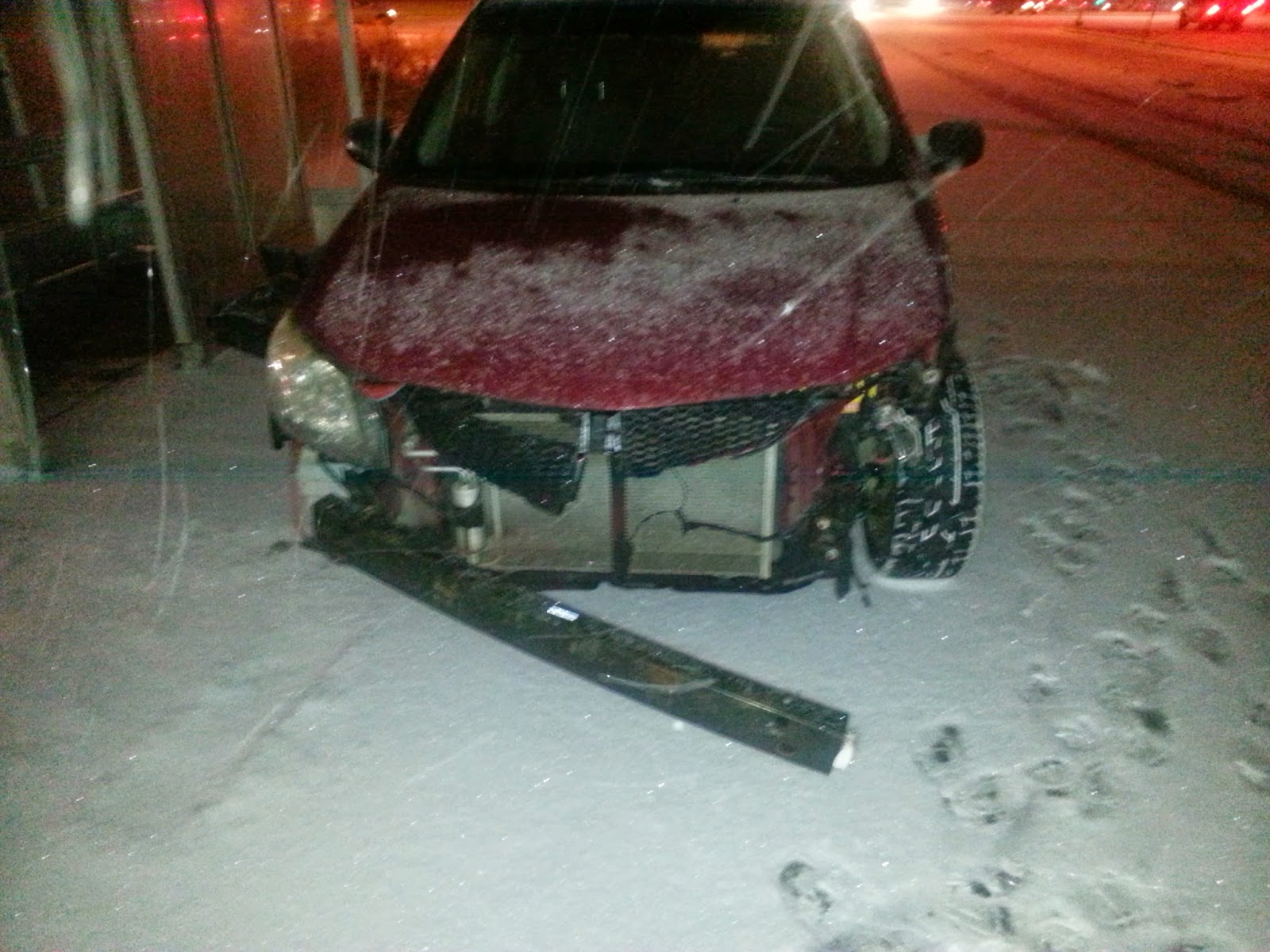 That evening I had a men’s group meeting. After the meeting is when things took a turn. I was on to some post-meeting appetizers at a nearby mexican restaurant (half-priced appetizers at that) with one of my friends from the group. It had started snowing and the temperature had dropped fast making the roads very icy. On the way to the restaurant I lost control of my car and…well you can see my sad car here…